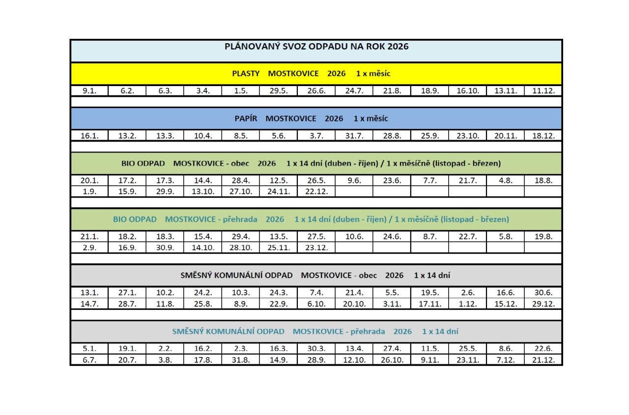 Obec zveřejňuje harmonogram svozu odpadu na rok 2026, který bude platný po celý rok. Svoz bude probíhat pravidelně podle stanovených termínů. Ke stažení zde:
