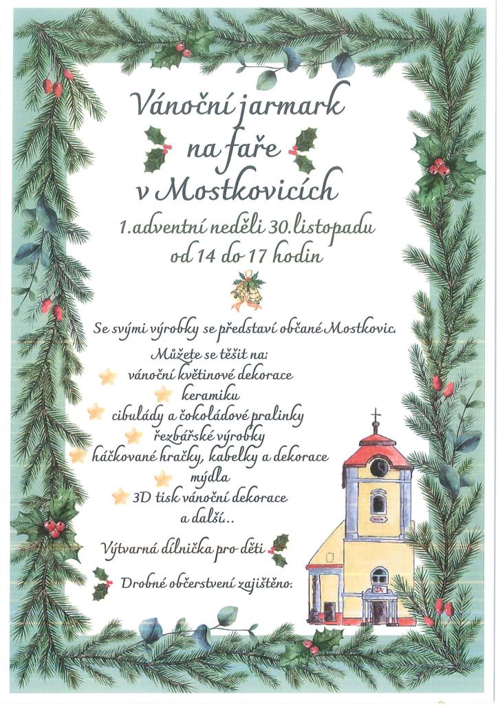 Občané Mostkovic se těší na vánoční trhy, které nabídnou široký výběr vánočních dekorací a výrobků. Akce se uskuteční v místním centru, kde si každý návštěvník najde něco pro sebe. Přijďte si užít vánoční atmosféru a podpořit místní řemeslníky. Těšíme se na vaši účast a věříme, že si odnesete krásné vzpomínky.