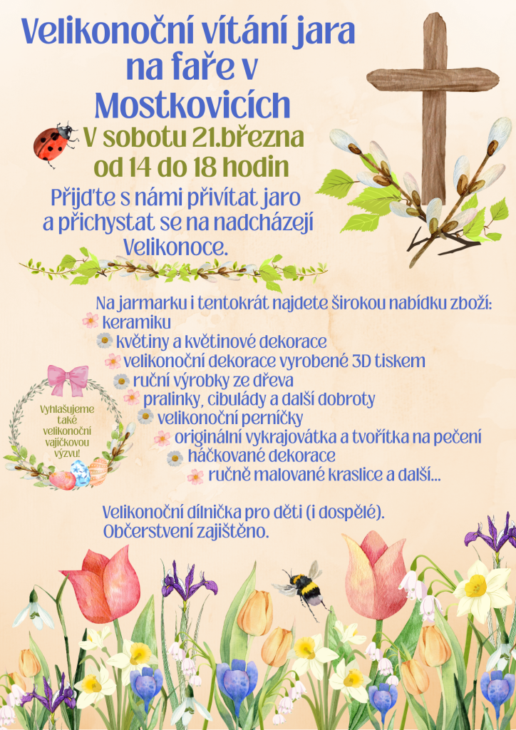 V sobotu 21. března 2026 se na faře v Mostkovicích uskuteční Velikonoční jarmark, který nabídne širokou škálu zboží, jako jsou keramika, květiny, velikonoční dekorace a ruční výrobky. Součástí akce bude také velikonoční dílnička pro děti i dospělé a občerstvení. Kromě toho je vyhlášena vajíčková výzva, která povzbudí všechny k tvoření a oslavě jara. Přijďte si užít tuto milou událost a přivítat přicházející Velikonoce.